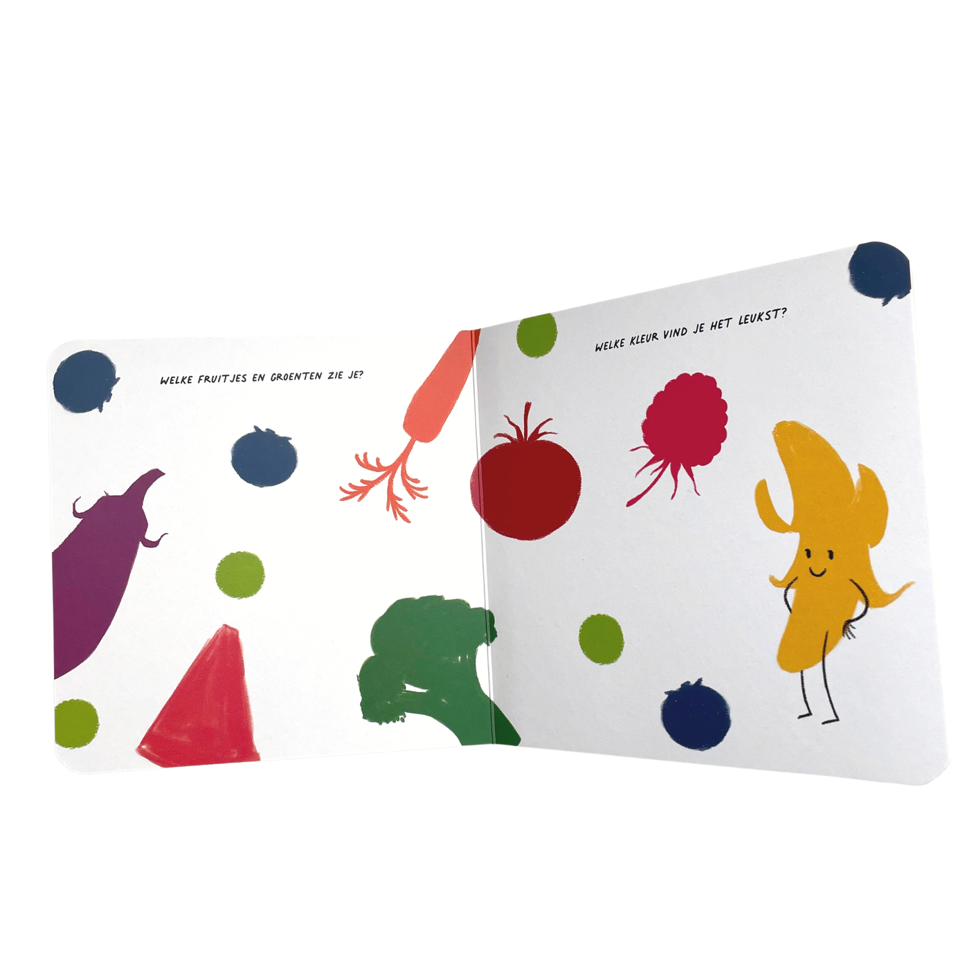 Een verrassend boekje op rijm over groenten en fruit met een hoekje af.