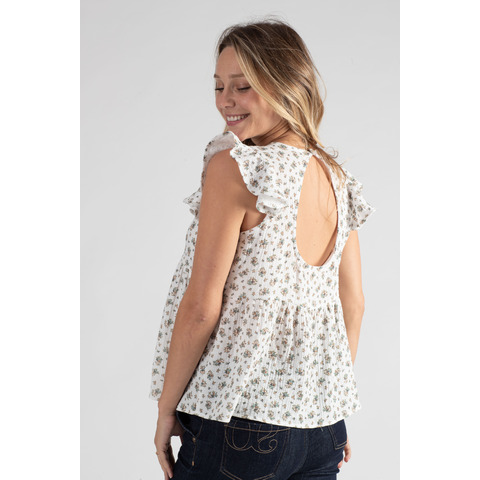 Het mooie bloemenpatroon, de ruches en de opening achterin maken deze top erg charmant.