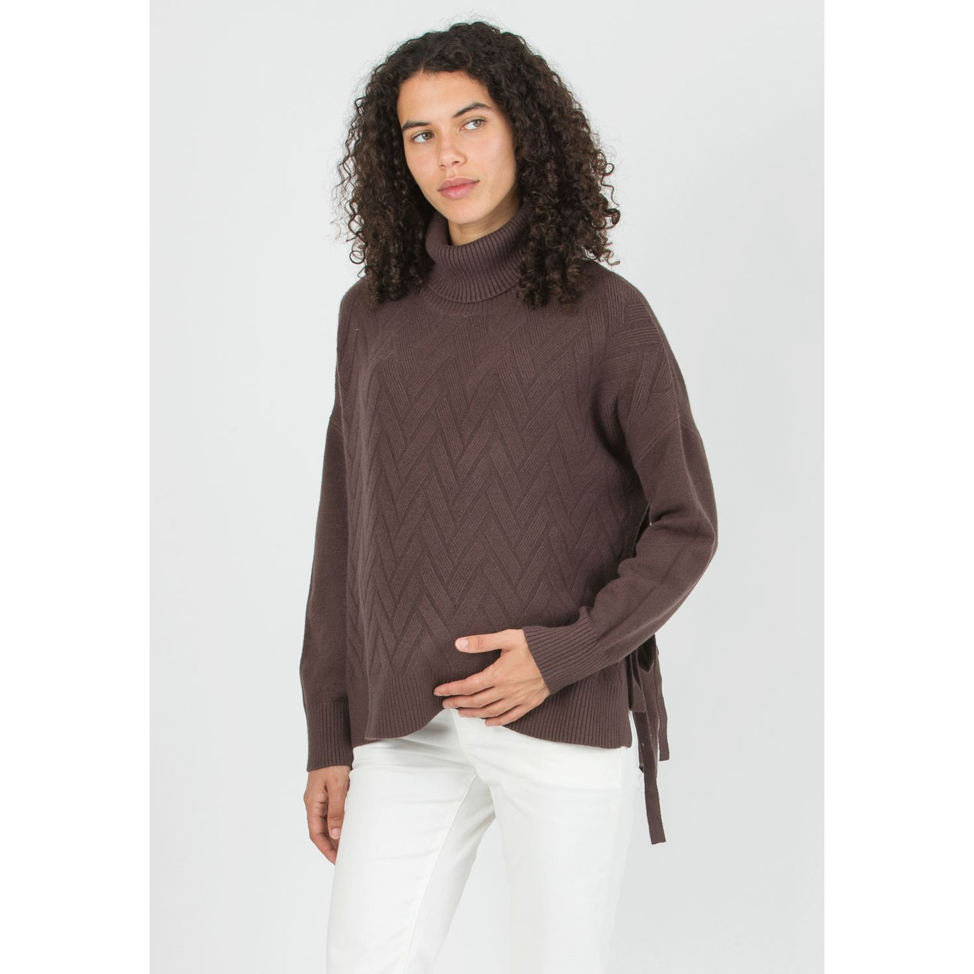 Deze zwangerschapstrui heeft een visgraatpatroon aan de voorkant, een col en de zijkant kan gesloten worden met een strik. Dankzij de openingen aan de zijkant is hij ook tijdens de borstvoedingsperiode een perfecte bondgenoot.
