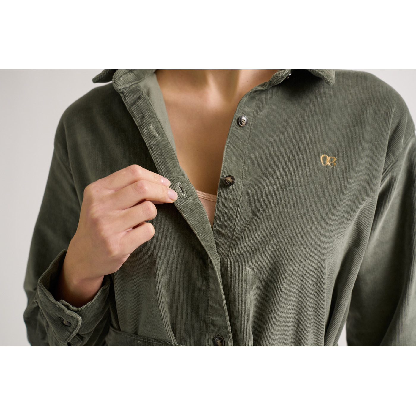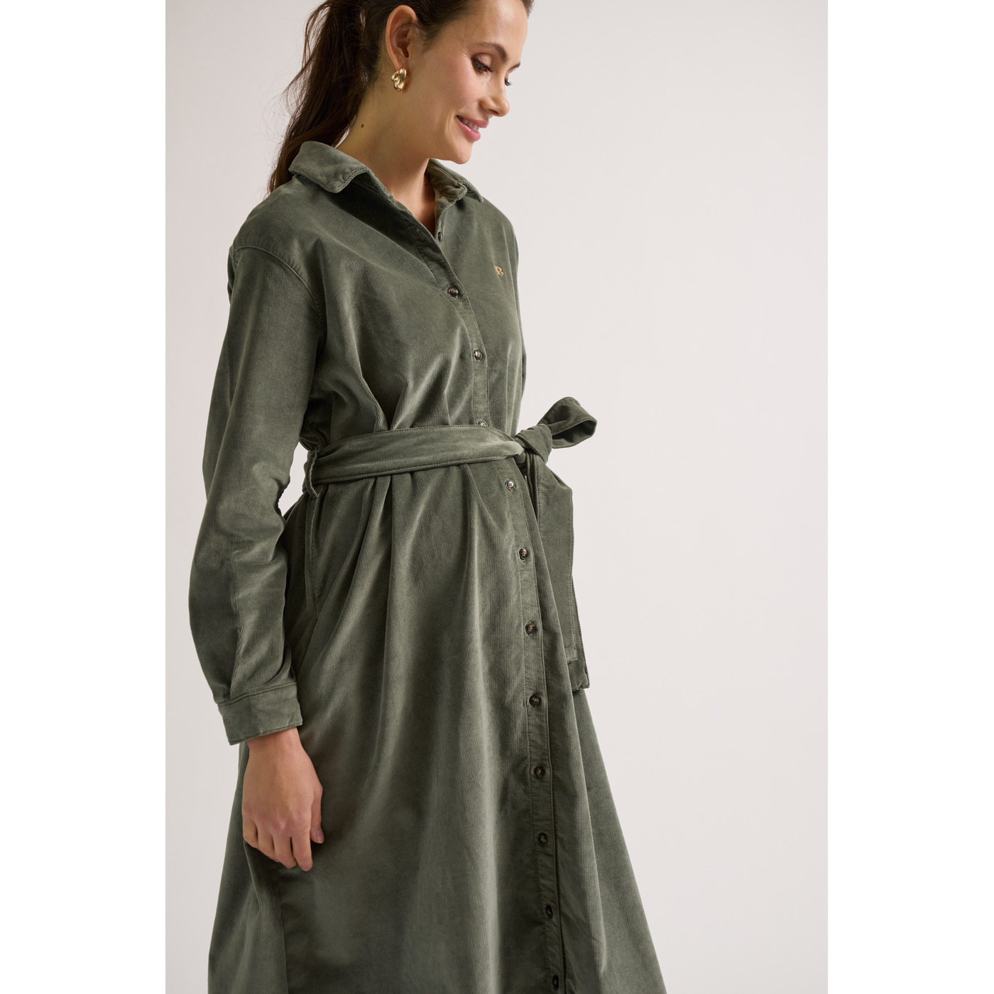 De Jude zwangerschapsjurk combineert de warmte van fijn ribfluweel (milleraies) met de zachtheid en souplesse van stretchmateriaal.