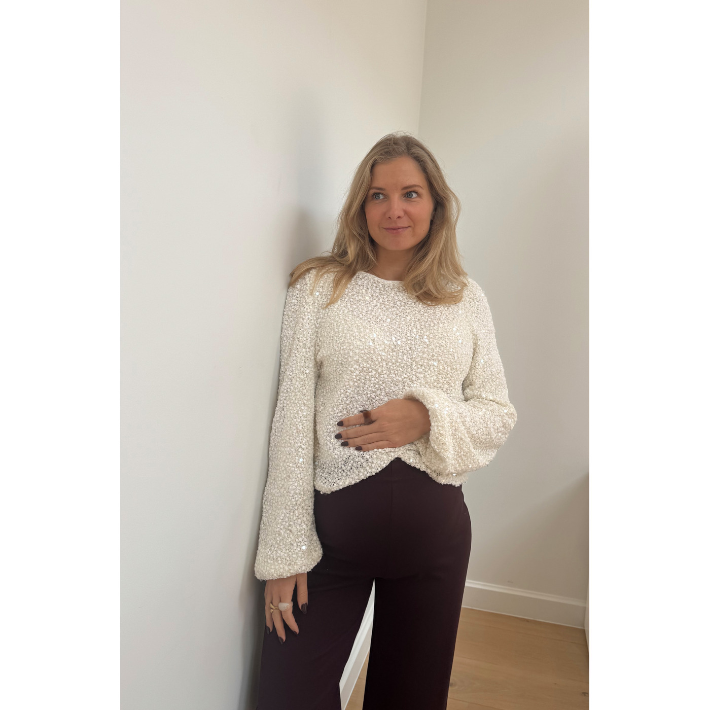Deze prachtige top met lange mouwen is gemaakt van een soepelvallende stof met subtiele pailletten, perfect voor een feestelijke look met een vleugje glamour.