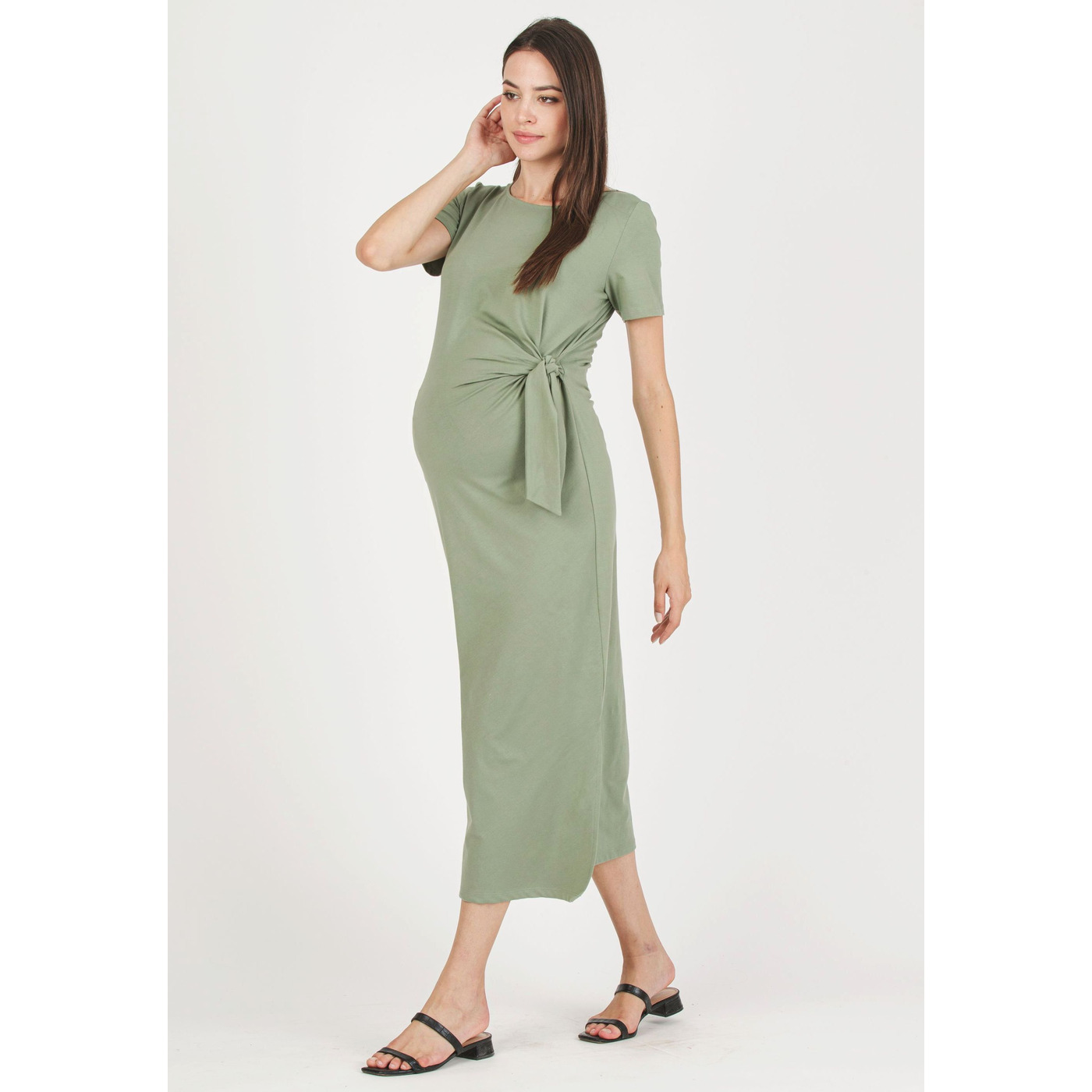 Deze zwangerschapsjurk van superstretch katoenjersey valt heerlijk zacht en vormt dankzij het zijstrikje subtiel je buik, waardoor je buikje mooi wordt benadrukt.