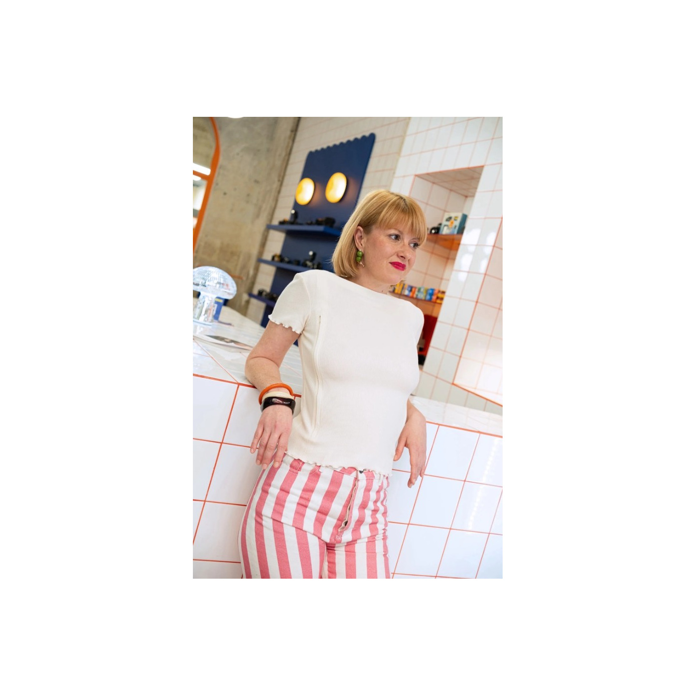 Fijngebreid T-shirt voor moeders, speciaal ontworpen voor eenvoudig voeden met dubbele openingen en ritssluitingen.