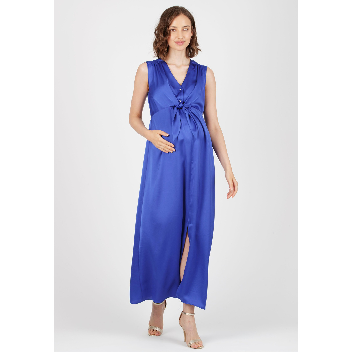 Elegant satijnen zwangerschapsjurk met een verfijnde V-hals, afgewerkt met stijlvolle gouden knoopjes.